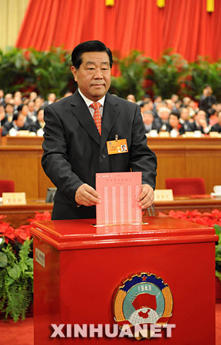 3月13日,全國政協十一屆一次會議在北京人民大會堂舉行第四次全體會議,選舉十一屆全國政協主席、副主席、秘書長和常務委員。這是全國政協十一屆一次會議主席團會議主持人賈慶林在投票。新華社記者馬占成攝