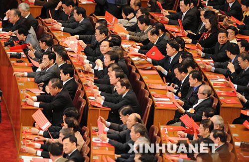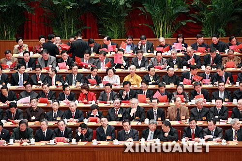 3月13日,全國政協十一屆一次會議在北京人民大會堂舉行第四次全體會議,選舉十一屆全國政協主席、副主席、秘書長和常務委員。這是委員們在查看選票。新華社記者李學仁攝