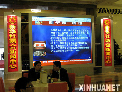 兩會期間,主要中央媒體紛紛在北京人民大會堂休息大廳“占據”有利地段,設置大屏幕,及時播報兩會最新消息。這是新華社兩會新聞中心設置的大屏幕(3月13日攝)。新華社記者張燕輝攝