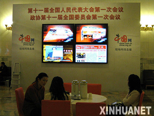 兩會期間,主要中央媒體紛紛在北京人民大會堂休息大廳“占據”有利地段,設置大屏幕,及時播報兩會最新消息。這是中國網設置的大屏幕(3月13日攝)。新華社記者張燕輝攝