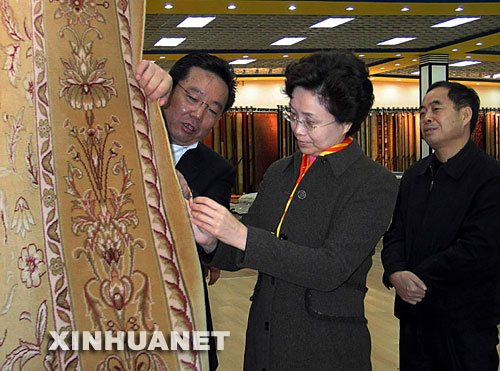 3月13日,十一屆全國人大一次會議大會休息日,全國人大代表、青海省省長宋秀巖到天津看望在當地發展的青海企業和務工人員。這是宋秀巖在青海藏羊集團天津地毯有限公司了解藏毯生產情況。 新華社記者馬勇攝