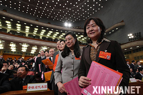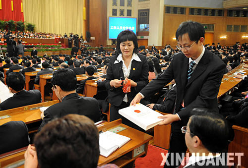 3月15日,十一屆全國人大一次會議在北京人民大會堂舉行第五次全體會議,選舉第十一屆全國人民代表大會常務(wù)委員會委員長、副委員長、秘書長;選舉第十一屆全國人民代表大會常務(wù)委員會委員;選舉中華人民共和國主席、副主席;選舉中華人民共和國中央軍事委員會主席。這是工作人員在發(fā)選票。新華社記者李學仁攝