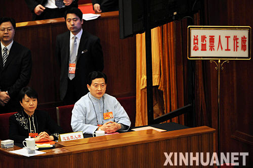 3月15日,十一屆全國人大一次會議在北京人民大會堂舉行第五次全體會議,選舉第十一屆全國人民代表大會常務(wù)委員會委員長、副委員長、秘書長;選舉第十一屆全國人民代表大會常務(wù)委員會委員;選舉中華人民共和國主席、副主席;選舉中華人民共和國中央軍事委員會主席。這是總監(jiān)票人工作席。新華社記者王建華攝