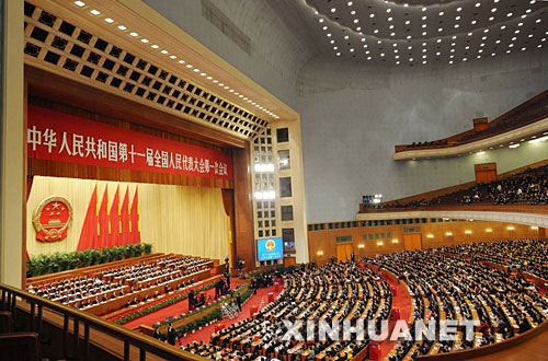 3月15日,十一屆全國人大一次會議在北京人民大會堂舉行第五次全體會議,選舉第十一屆全國人民代表大會常務委員會委員長、副委員長、秘書長;選舉第十一屆全國人民代表大會常務委員會委員;選舉中華人民共和國主席、副主席;選舉中華人民共和國中央軍事委員會主席。這是大會會場。新華社記者 楊宗友 攝