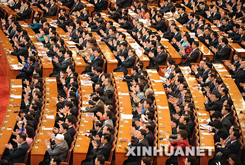 3月15日,十一屆全國人大一次會議在北京人民大會堂舉行第五次全體會議,選舉第十一屆全國人民代表大會常務委員會委員長、副委員長、秘書長;選舉第十一屆全國人民代表大會常務委員會委員;選舉中華人民共和國主席、副主席;選舉中華人民共和國中央軍事委員會主席。這是代表們在鼓掌。新華社記者 楊宗友 攝