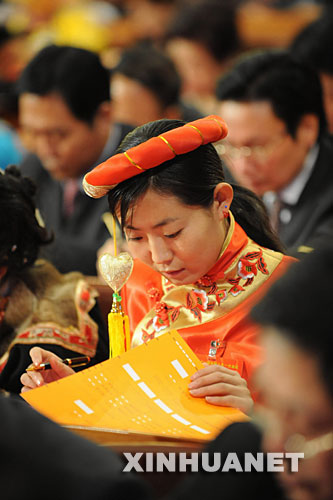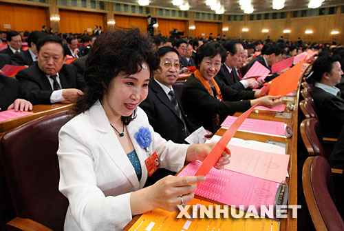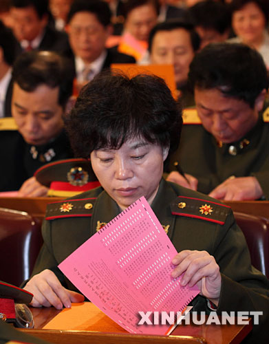 3月15日,十一屆全國人大一次會議在北京人民大會堂舉行第五次全體會議,選舉第十一屆全國人民代表大會常務委員會委員長、副委員長、秘書長;選舉第十一屆全國人民代表大會常務委員會委員;選舉中華人民共和國主席、副主席;選舉中華人民共和國中央軍事委員會主席。這是一位代表在查看選票。新華社記者王建民攝
