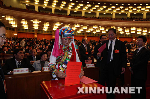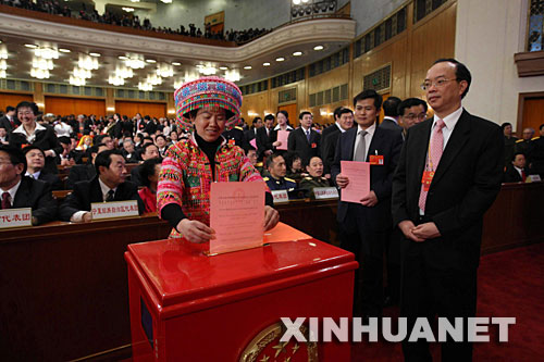 3月15日,十一屆全國人大一次會議在北京人民大會堂舉行第五次全體會議,選舉第十一屆全國人民代表大會常務(wù)委員會委員長、副委員長、秘書長;選舉第十一屆全國人民代表大會常務(wù)委員會委員;選舉中華人民共和國主席、副主席;選舉中華人民共和國中央軍事委員會主席。這是代表在投票。新華社記者劉衛(wèi)兵攝