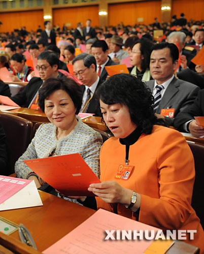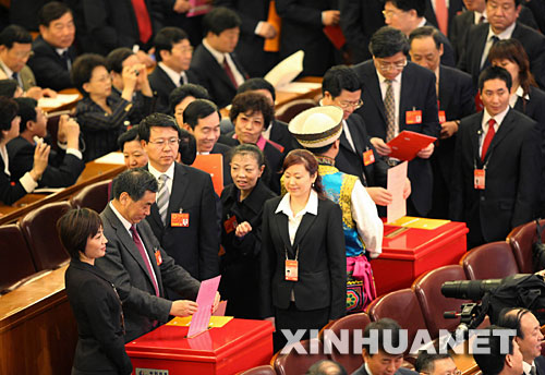 3月15日,十一屆全國人大一次會議在北京人民大會堂舉行第五次全體會議,選舉第十一屆全國人民代表大會常務委員會委員長、副委員長、秘書長;選舉第十一屆全國人民代表大會常務委員會委員;選舉中華人民共和國主席、副主席;選舉中華人民共和國中央軍事委員會主席。這是代表在查看選票。新華社記者李學仁攝