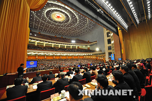 3月15日,十一屆全國人大一次會議在北京人民大會堂舉行第五次全體會議,選舉第十一屆全國人民代表大會常務委員會委員長、副委員長、秘書長;選舉第十一屆全國人民代表大會常務委員會委員;選舉中華人民共和國主席、副主席;選舉中華人民共和國中央軍事委員會主席。新華社記者樊如鈞攝