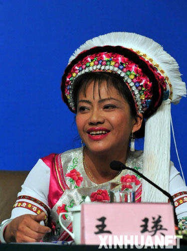 3月12日,來自云南的王瑛代表(白族)在八位連任全國人大代表集體采訪活動中回答記者提問。 新華社記者劉泉龍攝