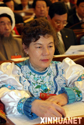這是來自新疆的全國人大代表拉依薩·阿列克桑德洛娜(俄羅斯族)在十一屆全國人大一次會議開幕會上。 新華社記者王建民攝