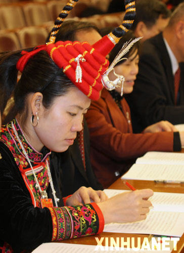 來自福建的全國人大代表雷金梅(畬族)在認真聽會。 新華社記者王建民攝