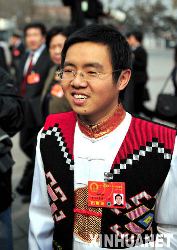 這是來自貴州的全國人大代表姚懿洲(侗族)在北京人民大會堂前。 新華社記者 劉泉龍 攝