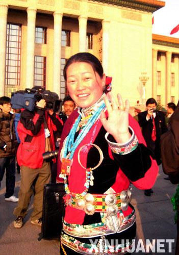 這是來自西藏的全國人大代表曉紅(珞巴族)在北京人民大會堂前。 新華社記者賈立君攝