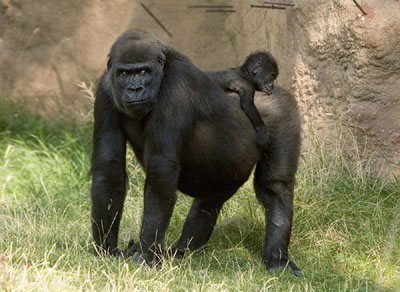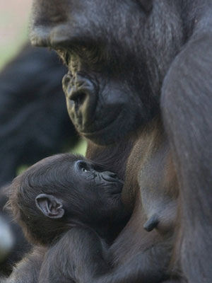 捷克首都布拉格動物園里的大猩猩基基芙帶著9周大的孩子塔圖出外曬太陽。
