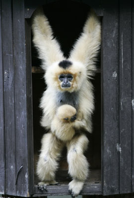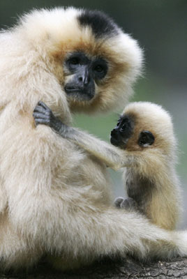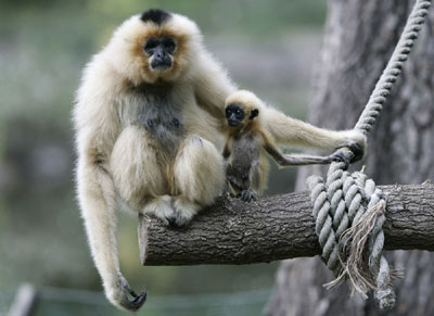同樣帶著孩子出外露臉的還有波蘭首都華沙動物園里的長臂猿母子倆。