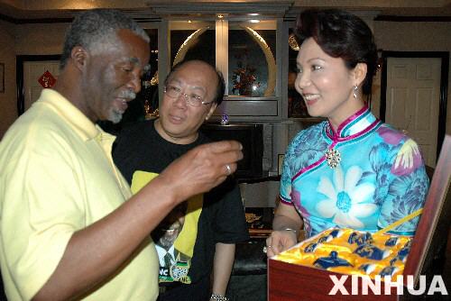 資料圖片:2006年2月17日,在南非約翰內斯堡東南300多公里的紐卡斯爾,南非總統姆貝基(左)在南非華人國會議員黃士豪(中)家里做客,鼓勵南非華人參政議政,投身南非的經濟建設。新華社記者陳銘攝