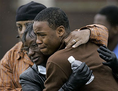 槍擊案發生后,一位母親見到兒子平安無事,與他擁抱哭泣。