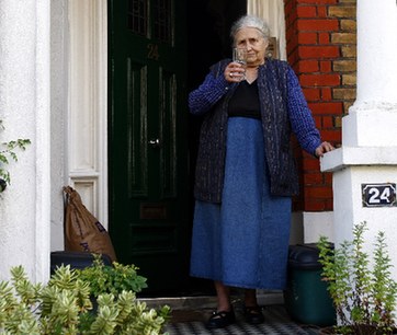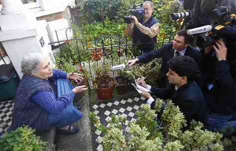 10月11日,萊辛在倫敦住宅門(mén)外與媒體記者交談