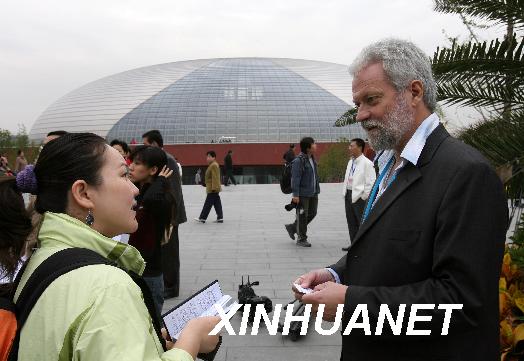 10月10日,丹麥政治報記者奧爾森在國家大劇院前接受新華社記者采訪。當(dāng)日,前來采訪中國共產(chǎn)黨第十七次全國代表大會的40多家境外媒體的120多位記者在北京參觀國家大劇院。新華社記者龐興雷 攝