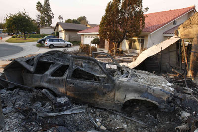 加州州長施瓦辛格說,大約6000人奮戰(zhàn)在滅火前線,大火還威脅著近7萬座房屋,包括普通民宅和明星們的豪宅,全州此次因火災造成的經(jīng)濟損失慘重。
