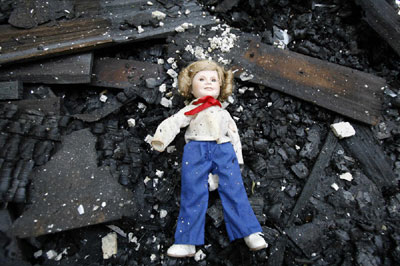 火災過后的廢墟上,一個被遺落的玩具娃娃。(英國媒體圖)