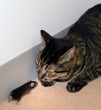在自然界,貓和老鼠之間從來沒有“友誼”可言,就像卡通片中“湯姆”和“杰瑞”一樣,你追我躲的游戲一刻不停。不過,日本科學家卻通過基因改造逆轉了老鼠的天性,讓它不僅敢與貓“大眼瞪小眼”,還能玩得親密無間,上演了一出現實版的《老鼠愛上貓》。