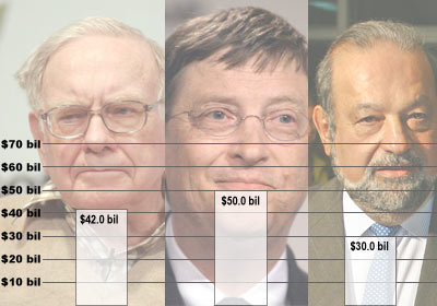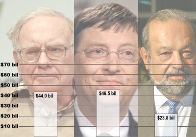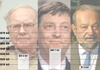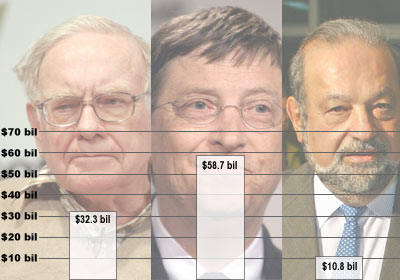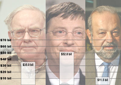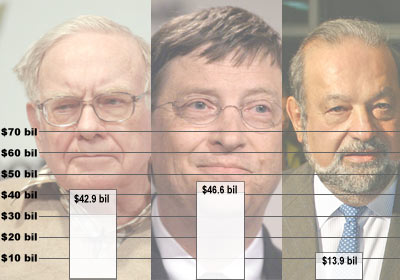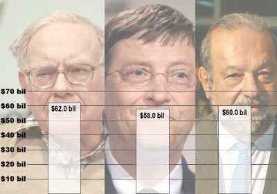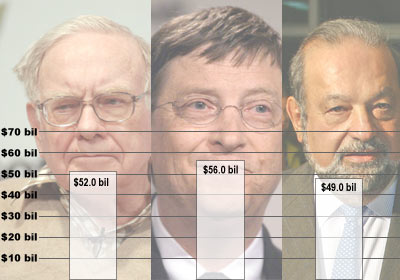 全球前首富蓋茨今年僅位居第三,身價580億美元,較上一年略增20億美元。排在《福布斯》富豪榜第二位的是墨西哥電信巨頭卡洛斯?斯利姆?埃盧,個人財富高達600億美元,比一年前飆升了110億美元。