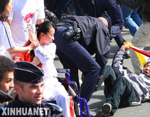 北京時間4月7日,奧運圣火來到法國首都巴黎進行傳遞。少數藏獨分子企圖搶奪火炬破壞傳遞活動,竟然無恥地把黑手伸向了坐在輪椅上的火炬手金晶。面對這突如其來的襲擊,柔弱的金晶始終緊緊抱著火炬。兇狠的暴徒拉扯著她的胳膊要把火炬搶走,金晶就扭過身讓出后背,用整個身體護住火炬,最終暴徒被警察制服并帶走。