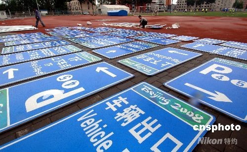 在通往各奧運有關場地的途中,寫有“2008北京奧運”的路牌十分醒目,這些路牌不僅明確標出場館、奧運村、新聞中心等主要場地的所在和路程,還有加油站、物流中心等相關配套地點的走向。
