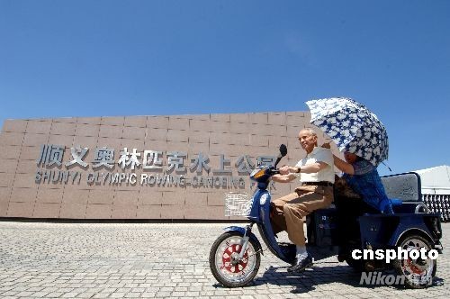 7月6日,北京一老年夫婦帶著自家寵物狗、騎著三輪車參觀北京順義奧林匹克水上公園。當日,北京艷陽高照,許多奧運場館吸引國內外游客前來參觀、拍照。中新社發 王東明 攝