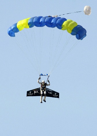 羅西乘坐的飛機從法國升空,他在距地面約2400米的空中跳出機艙,依靠噴氣動力翼以200公里時速,花了約10分鐘飛行35公里,然后打開降落傘在英國多佛爾附近海岸邊安全降落。