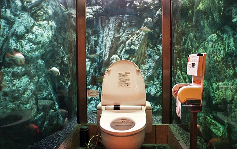 日本:一家名叫“Mumin Papa”的咖啡廳在水族館內做了一個水族廁所,如廁時周圍都是游來游去有海底生物。