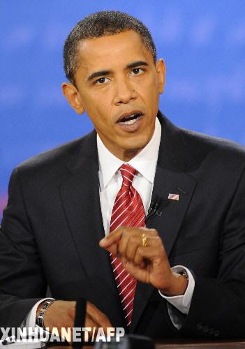 圖為10月15日,在美國紐約州亨普斯特德的霍夫斯特拉大學,美國民主黨總統候選人、伊利諾伊州國會參議員奧巴馬在與美國共和黨總統候選人、亞利桑那州國會參議員麥凱恩的辯論中發言。奧巴馬和麥凱恩當晚在霍夫斯特拉大學舉行總統選舉前的最后一場辯論。新華社/法新