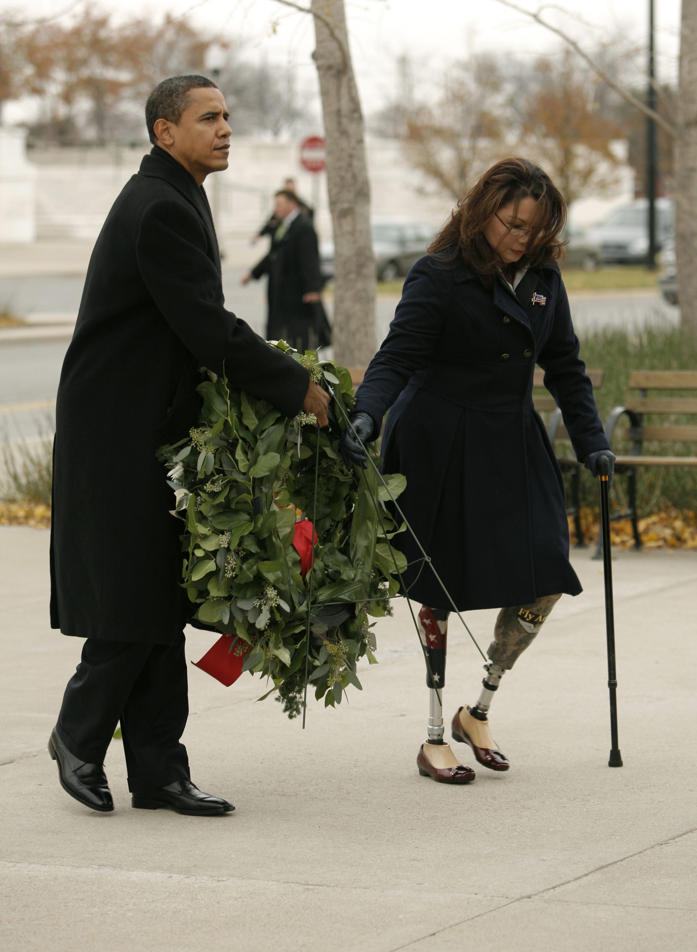 11月11日,美國(guó)當(dāng)選總統(tǒng)奧巴馬和伊拉克退伍女兵塔米·達(dá)克沃斯在芝加哥向退伍軍人紀(jì)念碑敬獻(xiàn)花圈。當(dāng)天是美國(guó)的退伍軍人紀(jì)念日。1918年11月11日,第一次世界大戰(zhàn)結(jié)束。