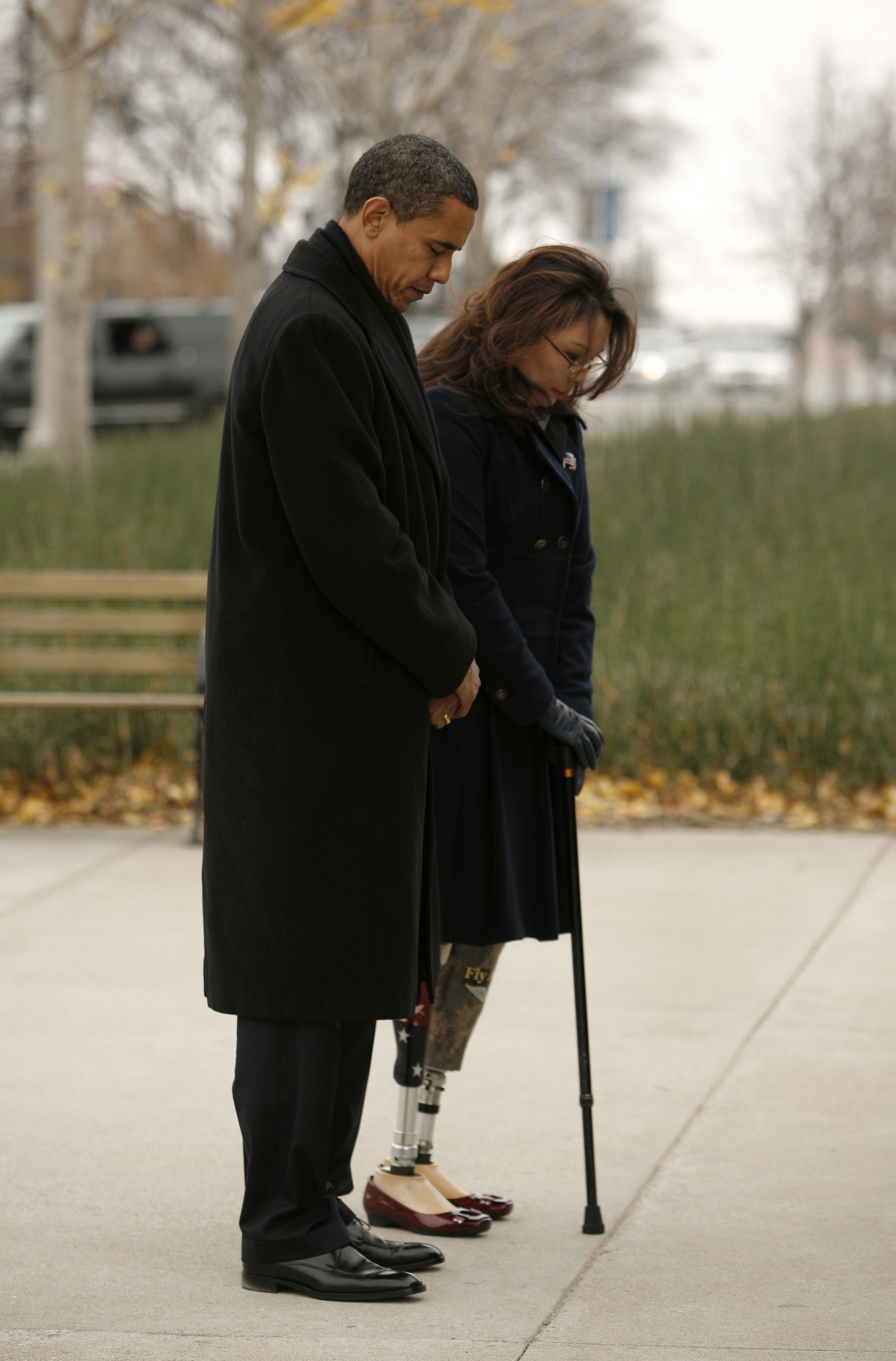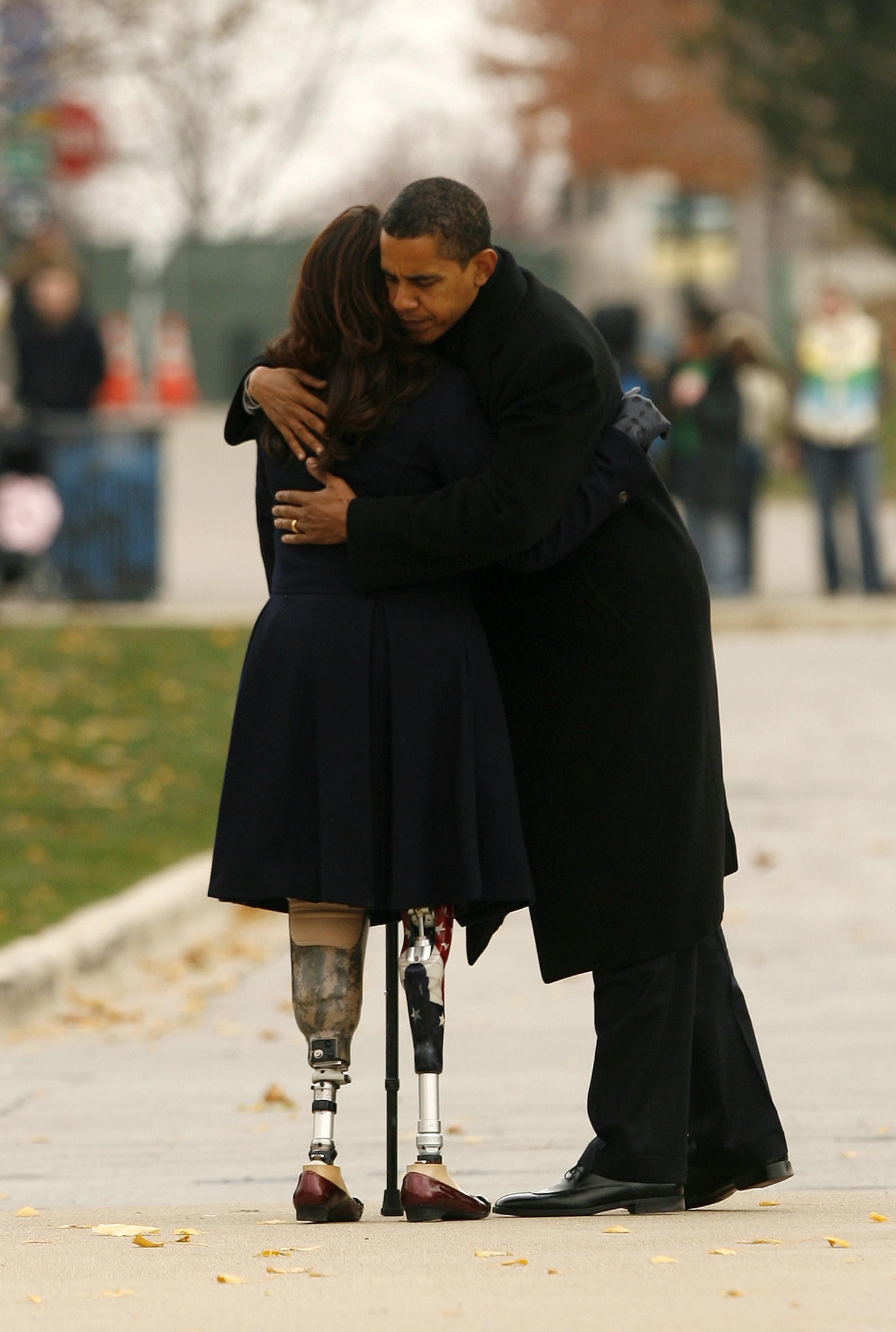 11月11日,美國(guó)當(dāng)選總統(tǒng)奧巴馬和伊拉克退伍女兵塔米·達(dá)克沃斯擁抱。當(dāng)天是美國(guó)的退伍軍人紀(jì)念日。1918年11月11日,第一次世界大戰(zhàn)結(jié)束。