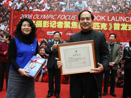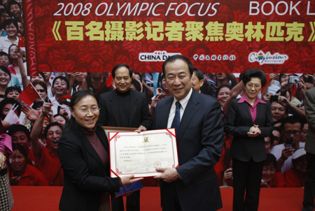 中國(guó)日?qǐng)?bào)總編輯朱靈向中央檔案館贈(zèng)予《百名攝影記者聚焦奧林匹克》畫冊(cè)。