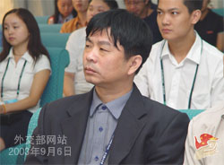 最后,公眾來到預示和平的橄欖廳。戴秉國副部長、沈國放部長助理在門口迎接公眾,與公眾進行交談、合影,將“走進外交部” 活動推向高潮。戴秉國副部長代表李肇星部長和外交部歡迎大家的到來,對公眾對外交的關心和支持表示感謝,并扼要介紹了中國總體外交政策和外交工作。