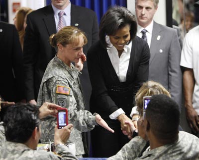 中國(guó)日?qǐng)?bào)網(wǎng)環(huán)球在線消息:據(jù)英國(guó)《每日電訊報(bào)》報(bào)道,3月12日,美國(guó)總統(tǒng)夫人米歇爾·奧巴馬探訪美國(guó)一處軍事基地,這是她首次以“第一夫人”的身份離開(kāi)首都華盛頓赴地方訪問(wèn)。在第二天的電視專(zhuān)訪中,奧巴馬夫人描述了自己在聽(tīng)到一些軍人家庭依靠食品券為生時(shí)的“痛心”,并承諾今后要為改善軍屬待遇出力。