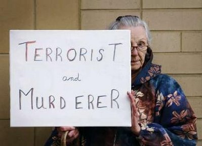 值得一提的是,示威場地有不少鞋子。一名婦女還拖著一臺發(fā)射鞋子用的加農(nóng)炮,炮口前方則掛著布什的海報。哭笑不得的警察只能無奈勸導(dǎo)這名婦女離開。 還有一名示威者則舉著一個“請他滾蛋”(Shoe Him The Door)的標(biāo)語,故意用Show的諧音字Shoe,暗喻去年12月,布什在巴格達(dá)記者會上遭伊拉克記者鞋擊這一尷尬事。