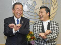 據聯合國官網報道,韓國竄紅流行音樂巨星“江南鳥叔”樸載相于紐約當地時間10月23日下午來到聯合國總部同潘基文秘書長進行了會面。潘基文還和鳥叔一起大跳“騎馬舞”,現場搞笑不斷。