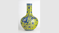 這個中國花瓶是23英寸(折合60厘米)高的黃底青龍花瓶,年代為20世紀初,但瓶底刻有18世紀時的乾隆印章,真?zhèn)紊写_認。