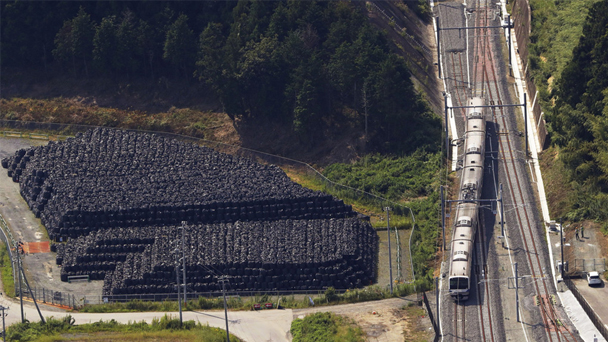 9月14日,日本福島常磐線列車在富岡町一段進行測試運行,鐵路旁整齊地堆放著從核污染區域清理出的放射性土壤。