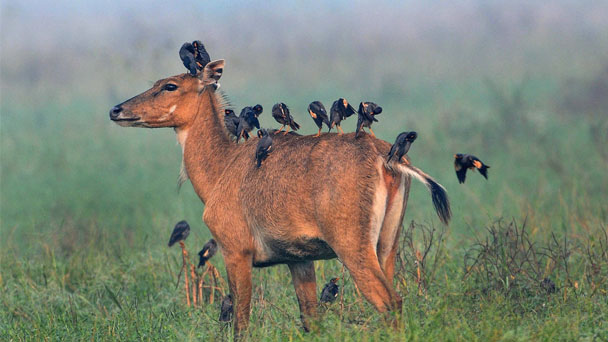 印度攝影師Afjal Khan在婆羅多布爾國(guó)家公園拍攝到搞笑一幕,成群的鷯哥休閑坐在鹿牛羚背上休息,它們井然有序地從鹿牛羚腦袋、脊背和尾巴上一字排開(kāi),悠然度日。