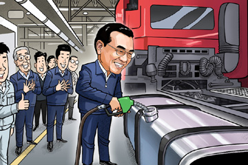 通過一把綠色加油槍,李克強(qiáng)總理為裝配線上一輛紅色重型卡車的油箱加滿了油。