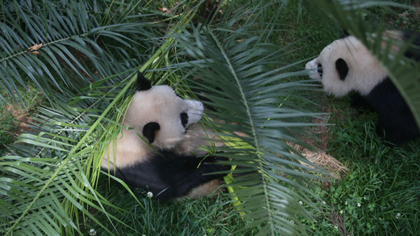 2016年4月29日,兩只大熊貓在云南野生動物園內玩耍、吃樹葉。