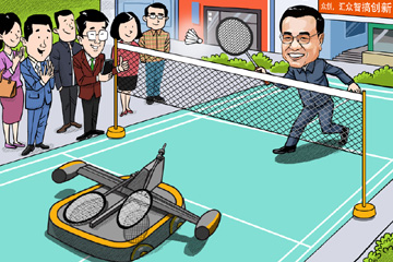 4月25日下午,李克強來到四川成都菁蓉創(chuàng)客小鎮(zhèn),與創(chuàng)業(yè)者交流。總理應(yīng)邀與創(chuàng)業(yè)團(tuán)隊設(shè)計的羽毛球機器人“切磋”球技。