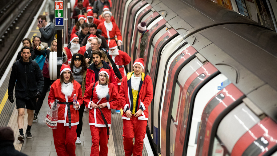 當(dāng)?shù)貢r間2017年12月3日,英國倫敦,倫敦圣誕老人慈善跑活動,男女老少圣誕裝穿越地鐵。