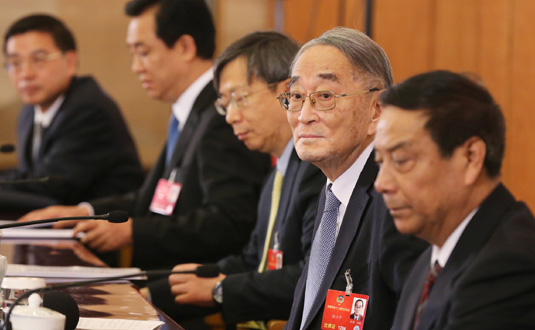 3月6日,全國政協十二屆四次會議在北京人民大會堂新聞發布廳召開記者會,邀請全國政協委員厲以寧、陳錫文、易綱、常振明、許家印就“十三五”經濟發展問題回答記者提問。