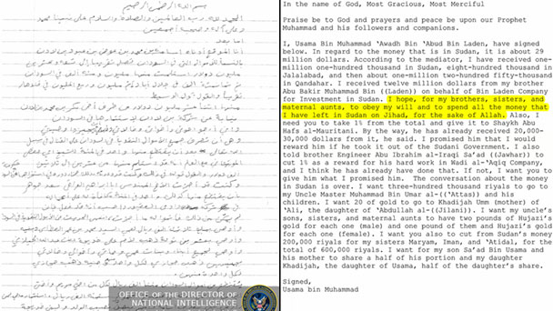 拉登在遺囑中特別寫明,留下的2900萬英鎊的遺產專門“為了真主,用于圣戰”。